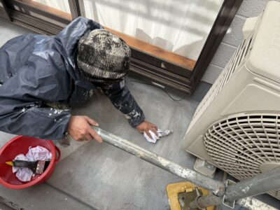 バルコニー床の防水前の下地処理を行っております。